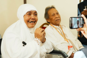RNGT Endang Tri Nurniningsih, jemaah Penyandang Disabilitas bersama suaminya, Khuya'i. nusakini.com, - Keikhlasan akan takdir Allah Swt patut diteladani dari RNGT Endang Tri Nurniningsih, salah satu jemaah haji kelo...