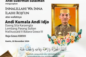 nusakini.com, Gowa - Raja Gowa ke-38, Andi Kumala Idjo Karaeng Lembang Parang, yang juga dikenal sebagai Sombayya, meninggal dunia, Kamis 28 November 2024. Andi Kumala Idjo meninggal dunia Kamis (28/11/2024) pada pu...