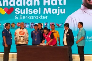 MAKASSAR -- Sebanyak 10 (sepuluh) pimpinan partai pengusung dan pendukung Calon Gubernur-Wakil Gubernur Sulawesi Selatan (Cagub-Cawagub Sulsel) Andi Sudirman Sulaiman-Fatmawati Rusdi menandatangani naskah deklarasi pasan...