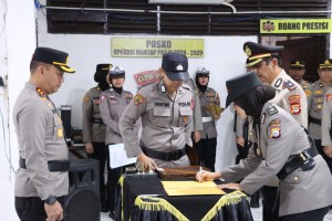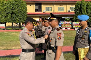 MAKASSAR -- Kapolres Pelabuhan Makassar AKBP Restu Wijayanto memimpin langsung proses upacara serah terima jabatan, beberapa perwira kepolisian, yang menerima promosi dan mutasi jabatan oleh Kapolda Sulsel, Jum'at (30/0...