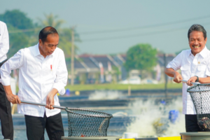 nusakini.com, Presiden Joko Widodo didampingi Menteri Kelautan dan Perikanan Sakti Wahyu Trenggono meresmikan modeling kawasan tambak budidaya ikan nila salin (BINS) di Karawang, Jawa Barat, Rabu (8/5/2024). Modeling tam...