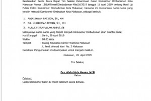 nusakini.com-Makassar-Setelah melalui beberapa rangkaian tes seleksi calon komisioner ombudsman kota makassar maka di peroleh tiga kriteria yang bakal menjadi ketua dan anggota Ombudsman Kota Makassar periode 2019 - 2024...