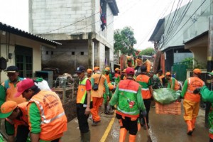 • Petugas Gabungan Bersihkan Sampah Sisa Banjir di Kemang Timur